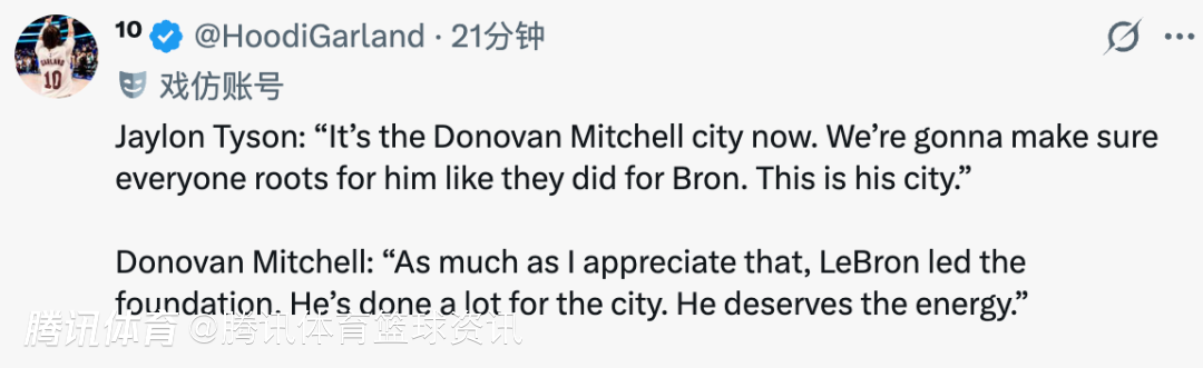 谈及如何评价詹姆斯对这座城市以及这支球队的影响,泰森先过来打岔:“这么说吧,现在这里是属于米切尔的城市了。但等他(勒布朗)再次回到这里,我们依然会像以往一样,为他留出足够的尊重与空间,就像球迷们一直做的那样。这就是这座城市的样子。”
