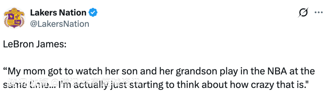 另外,詹姆斯也表示:“我妈妈能够同时看到她的儿子和孙子在NBA打球,我现在才开始意识到,这是一件多么不可思议的事。”