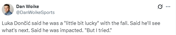 赛后,谈到自己因骑士主场的地板落差崴脚,东契奇表示自己已经“有点幸运了”,并称会观察后续情况,他坦言自己受到了影响,自己已经尽力了。