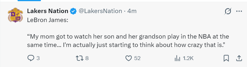 老詹继续说道:我妈妈能够同时见证自己的儿子、孙子在NBA打球,我其实刚刚在看视频时思考这有多么的不可思议。