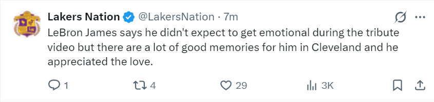 在洗完澡后勒布朗接受了采访,他谈到骑士主场为他播放致敬视频:在观看致敬视频时,我自己也没想到自己会如此动情,但我在克利夫兰有很多美好的回忆,我很感激骑士对他的这份关爱。