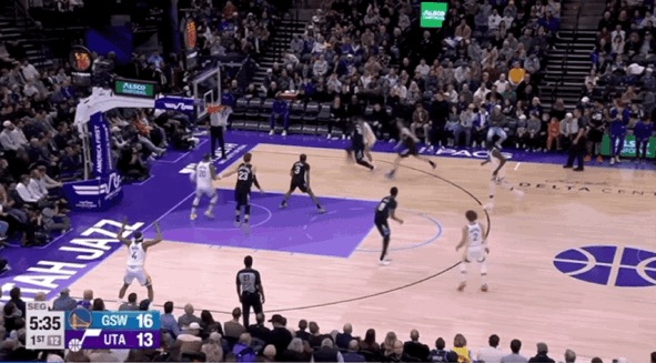 易边再战,库里保留足够的体能在下半场发力,他先是突破挑篮得手,随后造成三分犯规3罚全中。当爵士尝试迫近分差时,库里反手上篮为球队打破僵局,随后在外线飙进三分。库里逐步接管进攻端,他引领勇士打出一波12-4的进攻高潮,成功帮助勇士扩大领先优势到20+。