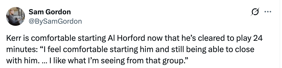 谈及自己是否倾向于继续让霍福德担任首发(最近两场比赛均是首发出战),科尔表示:“我确实是这么想的,我真的很喜欢这样的安排。现在他的出场时间限制是24分钟,在这个前提下,我觉得让他首发,同时最后关键时刻依然能让他留在场上收官,是很稳妥的安排。我们可以算好时间进行调配,而且让他和追梦一同首发,在比赛开局阶段的防守端效果非常好。所以我很喜欢这套组合的表现,我觉得我们已经把这些安排理顺了。”