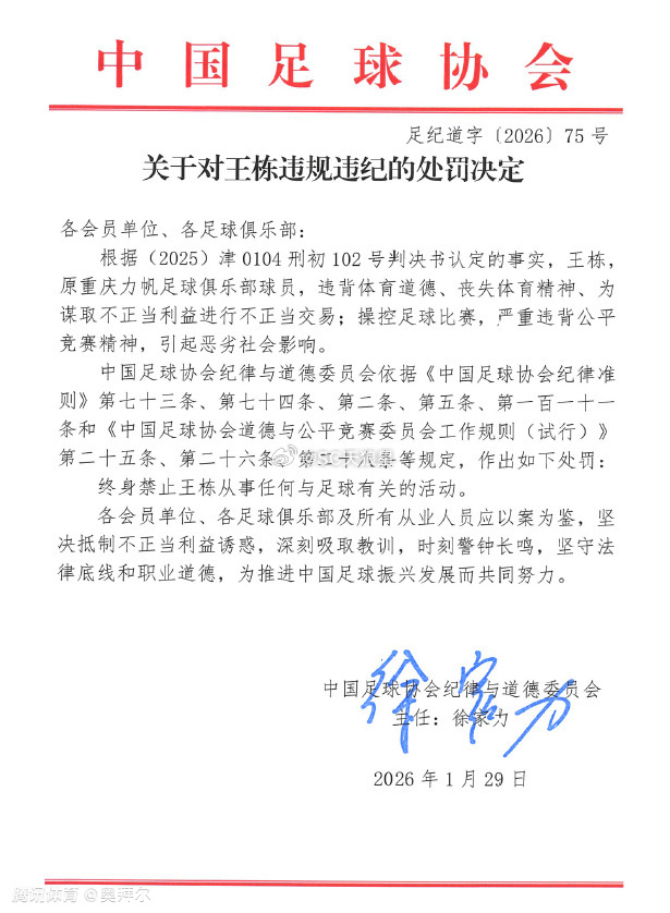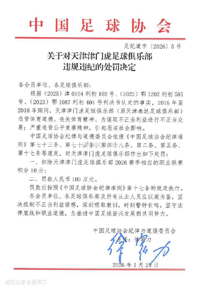 2026-01-29 13:50周四,中国足协正式公布受处罚俱乐部名单。天津津门虎被罚10分,王栋、邓小飞则遭到终身禁足。
