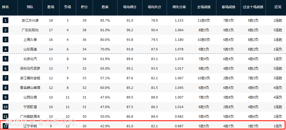截止目前,辽宁男篮的战绩为9胜12负,排在积分榜第十二位。杨鸣离职之后,辽宁男篮的战绩为1胜1负。