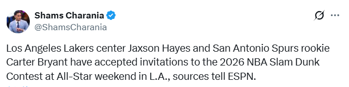 2026-01-30 05:50近年来,NBA扣篮大赛的光彩已黯淡不少。北京时间1月30日,据名记Shams报道,今年四位参赛选手名单中的两人已经确定,他们分别是湖人中锋海斯和马刺侧翼卡特-布莱恩特。此前,三届扣篮王麦克朗已宣布不会参赛。