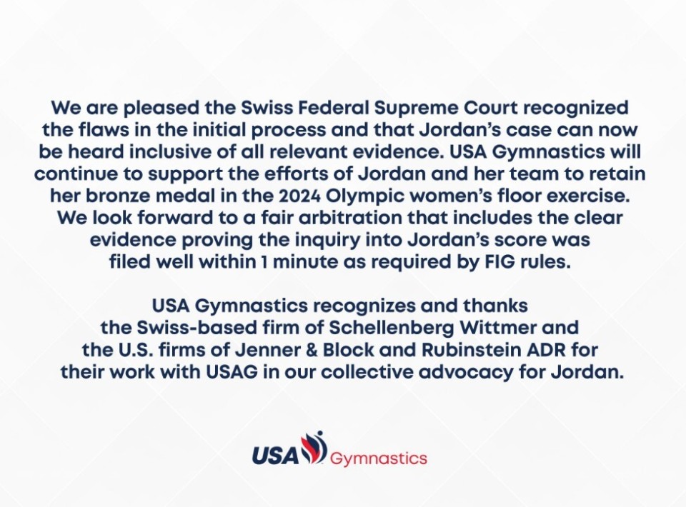 在瑞士高院发声之后,美国体操协会随即发表了一份声明。声明中表示:“我们很高兴瑞士联邦高院承认了初始程序的缺陷,并且乔丹的案件现在可以包括所有相关证据得到审理。美国体操协会将继续支持乔丹和她的团队保留她在2024年奥运会女子自由体操中的铜牌。我们期待一个公平的仲裁,包括证明对乔丹分数查询在FIG规则要求的1分钟之内提交的明确证据。”