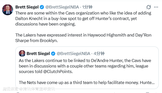 2026-01-30 09:00北京时间1月30日,据记者Brett Siegel报道,联盟消息人士向ClutchPoints透露,湖人持续与德安德烈-亨特传出绯闻的同时,骑士也正和其他几支球队商谈关于亨特的交易。