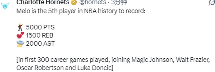 根据黄蜂队官方发布的数据统计显示,鲍尔是NBA历史上第5位能在生涯前300场比赛中得到至少5000分1500篮板2000助攻的球员,仅次于“魔术师”约翰逊、沃尔特-弗雷泽、奥斯卡-罗伯特森和卢卡-东契奇。