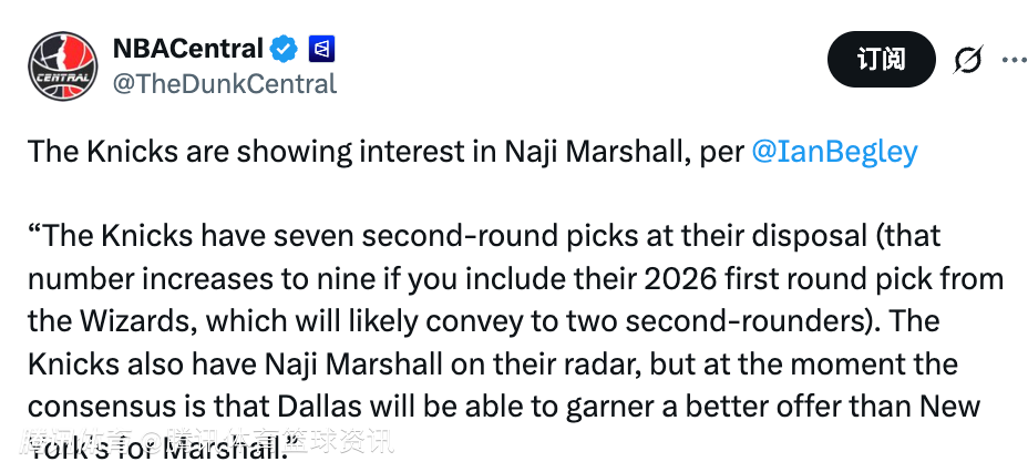 贝格利表示:“尼克斯目前手握7个次轮选秀权(如果算上2026年来自奇才队的首轮签——该签位大概率会转化为两个次轮签,这一数字将增至9个)。同时,尼克斯也将纳吉-马绍尔纳入了引援考察范围,但目前普遍认为,达拉斯独行侠队能够为马绍尔开出比纽约更优厚的报价。”
