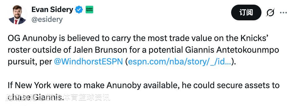 在尼克斯追求字母哥潜在交易中 阿奴诺比是除布伦森之外最具交易价值球员