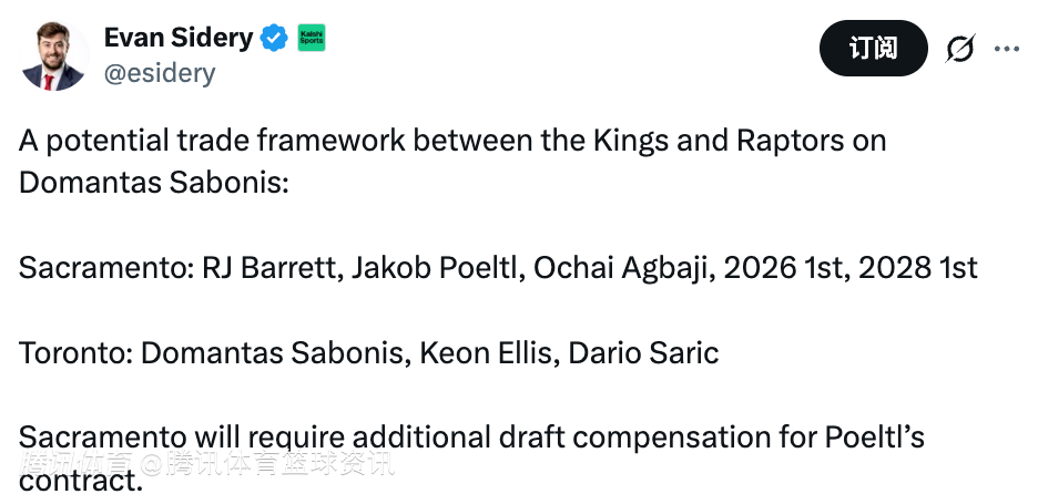 2026-01-31 00:10北京时间1月30日,据美记Evan Sidery报道,国王和猛龙正商讨一笔关于小萨博尼斯和巴雷特等人互换的交易。
