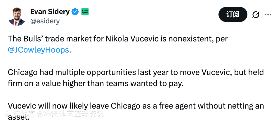 据悉,芝加哥公牛队去年其实有多次机会送走武切维奇,但他们一直坚持索要远超其他球队心理预期的交易筹码,导致交易未能达成。如今,武切维奇很可能将以自由球员身份离开公牛队,而球队将无法通过交易得到任何回报。