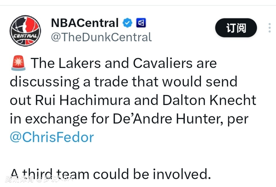 2026-01-31 05:10北京时间1月31日,据骑士记者费多尔报道,湖人队正寻求补强锋线位置,目前已与骑士队开启谈判,商讨引进亨特的相关交易方案。