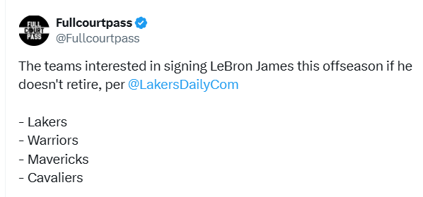 消息称,詹姆斯的现东家洛杉矶湖人队,以及金州勇士队、达拉斯独行侠队、克利夫兰骑士队,均有意在休赛期签下詹姆斯。