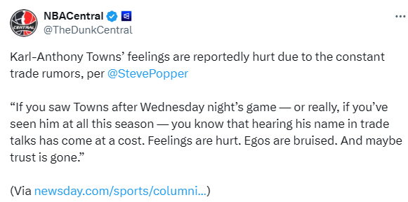 Popper表示:“持续不断的交易传闻让唐斯感到受伤。如果你看过近期赛后的唐斯,或者说如果你看过他本赛季的任何表现,就会明白,名字反复出现在交易流言中是有代价的。他的情感受到了伤害,自尊心受挫,甚至可能对球队的信任也已不复存在。”