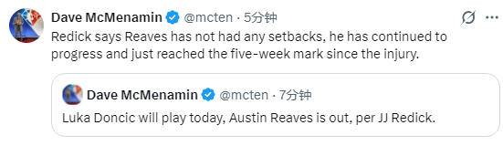 此前,因小腿拉伤缺阵17场的里夫斯比赛状态升级为出战成疑。东契奇因左脚踝酸痛,同样列为出战成疑。
