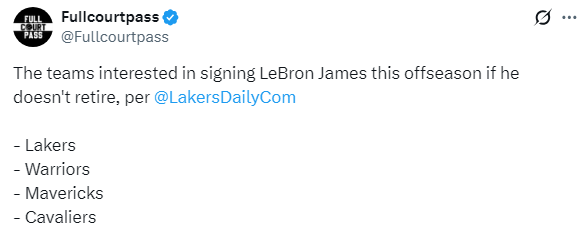 湖人队已经公开和私下表示,他们希望詹姆斯在湖人队退役;消息人士透露,若詹姆斯今年休赛期不退役,他很有可能回归湖人,因为他与东契奇、里夫斯和雷迪克的关系亲密,而且他的儿子布朗尼也为湖人效力。