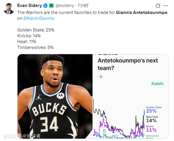 美媒更新字母哥最可能下家概率,勇士获得字母哥概率升到25%,尼克斯14%,热火11%和森林狼5%;换言之,目前勇士领跑字母哥争夺战,究竟未来一周会发生什么大交易?拭目以待吧。