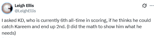 NBA记者埃利斯通过计算后告知杜兰特:要想超越贾巴尔,成为历史得分榜的第二,杜兰特需要在接下来出战的268场比赛中,保持场均25分的水准。