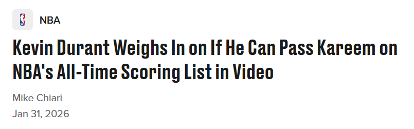 2026-01-31 07:40北京时间1月31日,杜兰特退役时的总得分能排名历史第几?近日他和记者一起算了算分,随后感慨前辈们的门槛太高了。