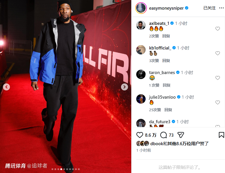 杜兰特的动态引热议,德文-布克、塔图姆、切特-霍姆格伦、洛瑞等球员纷纷为KD点赞;美球迷留言或者晒表情调侃,不过杜兰特已经开启了禁止评论,目前这篇帖子已经限制评论了。