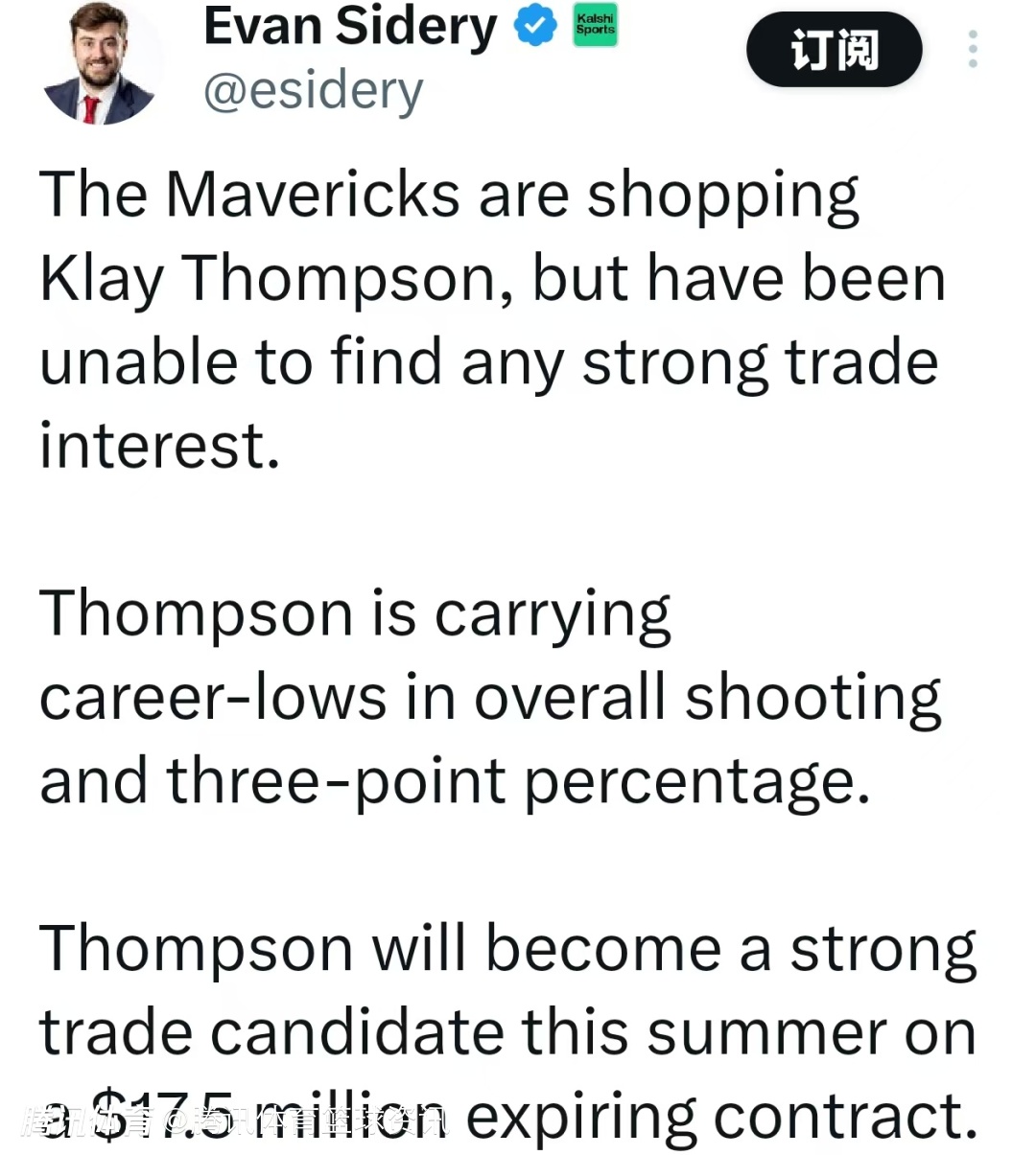 2026-01-31 08:10北京时间1月31日,据记者Evan Sidery报道,独行侠正兜售克莱-汤普森,但目前尚未收到任何实质性的交易意向。