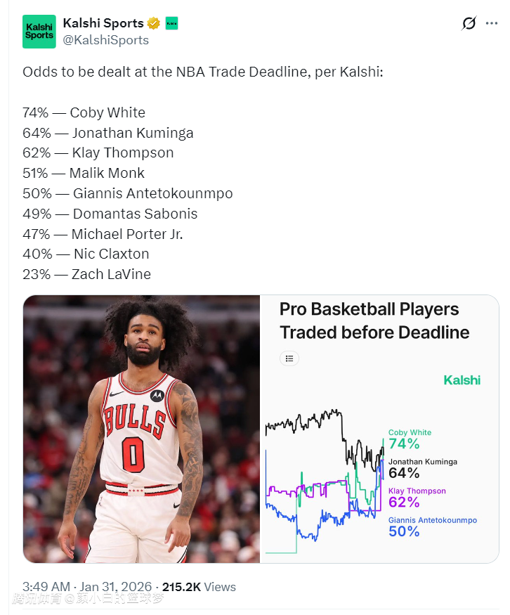 2026-01-31 10:00北京时间1月31日凌晨,美媒KS分析了目前联盟最可能被交易的球员,公牛的科怀-怀特概率高达74%联盟第一,就连库明加、扬尼斯等申请交易的球员都在他之后。