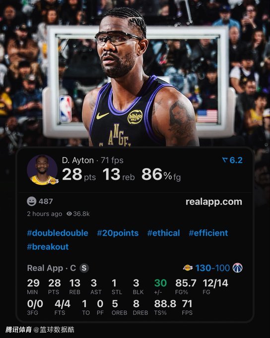 数据显示,当艾顿得分达到至少20分,湖人10胜0负。当艾顿得分达到至少15分,湖人17胜1负。当艾顿单场轰下至少15分+10篮板,湖人13胜0负。