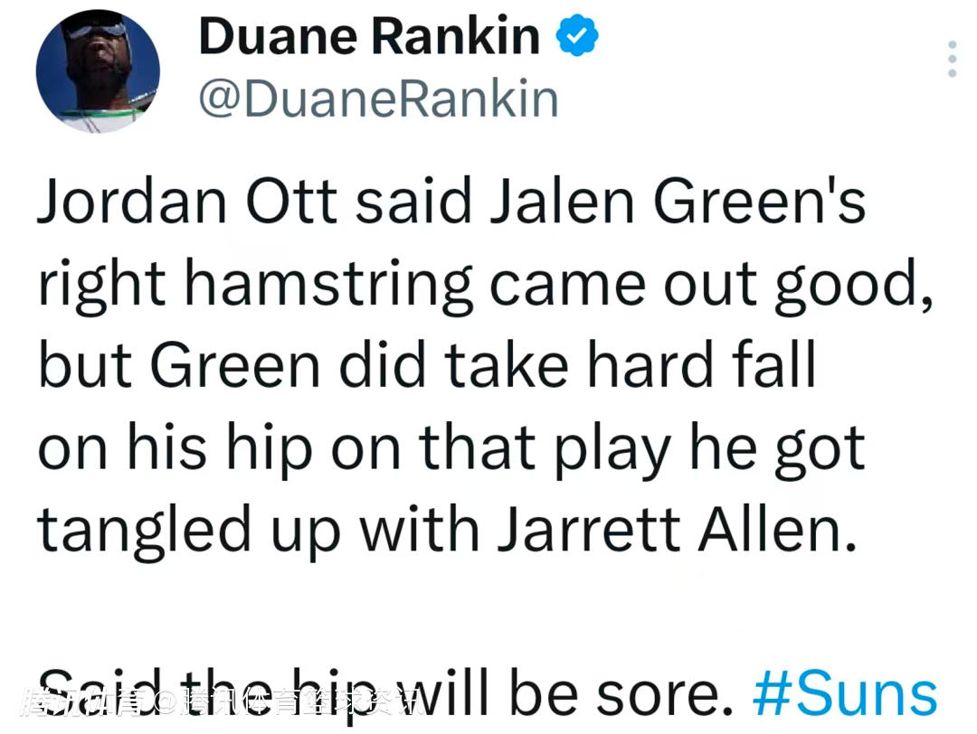 本场比赛,太阳球星杰伦-格林出战15分钟,得到11分4篮板1助攻。赛后据太阳官方消息,由于臀部挫伤,杰伦-格林赛后将不接受媒体采访。