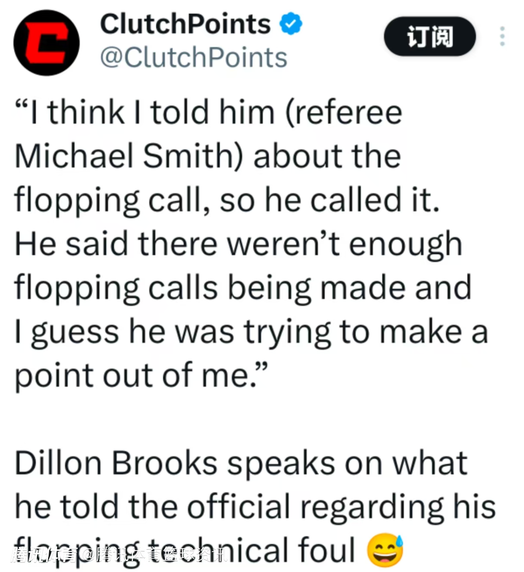狄龙在谈及比赛中因假摔判罚吃到技犯时表示:“我当时跟主裁迈克尔-史密斯说了关于假摔判罚尺度的问题,他随后就做出了判罚。他说当下赛场的假摔判罚力度不够,我猜他就是想拿我这个球来立个规矩。”
