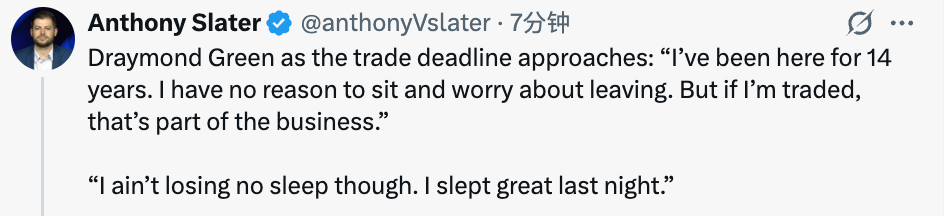 交易截止日日益临近,追梦也谈到自己在勇士队的未来:“我已经在这里效力14年了,没理由坐在这里担心自己会被送走。但如果真的被交易,那也是生意的一部分,该怎么样就怎么样。不过我完全没为此失眠,昨晚睡得可香了。”