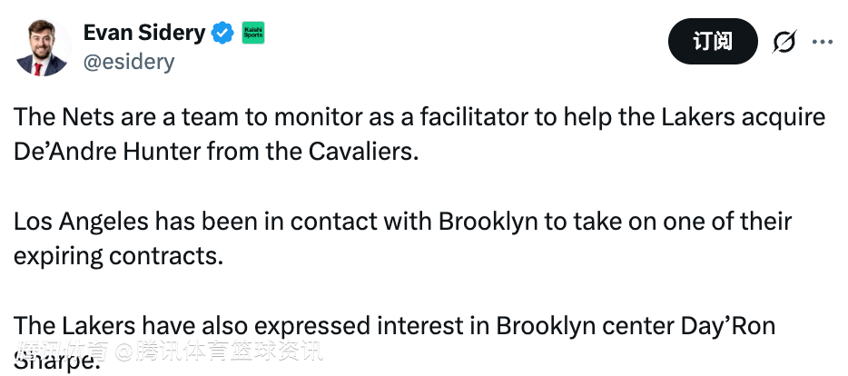 2026-02-01 00:30北京时间2月1日,据美记Evan Sidery报道,篮网队正扮演着关键的第三方角色,很可能作为交易的“促成方”,帮助湖人从骑士队得到亨特。