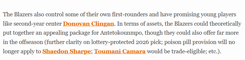 此外,开拓者还握有部分自家首轮签,队中也不乏潜力新星,例如二年级中锋克林根。从筹码层面来看,开拓者理论上能够为得到字母哥拼凑出一份颇具吸引力的交易方案,不过到了休赛期,他们能拿出的筹码还会更加丰厚(2026年受乐透保护的首轮签归属将更加明确;谢登-夏普合同中的毒药条款将失效;图马尼-卡马拉将具备交易资格,等等)。