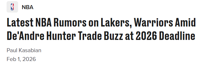 2026-02-01 05:30北京时间2月1日,随着交易截止日临近,洛杉矶湖人和金州勇士均与克利夫兰骑士队前锋德安德烈-亨特产生交易传闻,但两队似乎都不太可能得到这位球员。名记Fischer与Stein今日报道了这一消息,并解释了勇士和湖人大概率无缘的原因。