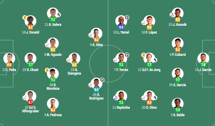 巴塞罗那:霍安-加西亚;孔德(84'阿劳霍),库巴西,埃里克-加西亚,巴尔德;费尔明(84'卡萨多),德容,奥尔莫(62'贝尔纳尔);亚马尔,费兰-托雷斯(62'莱万多夫斯基),拉菲尼亚(46'拉什福德)