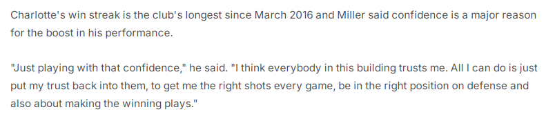 黄蜂的六连胜是球队自2016年3月以来的最长连胜纪录。米勒表示,信心是他状态提升的主要原因。
