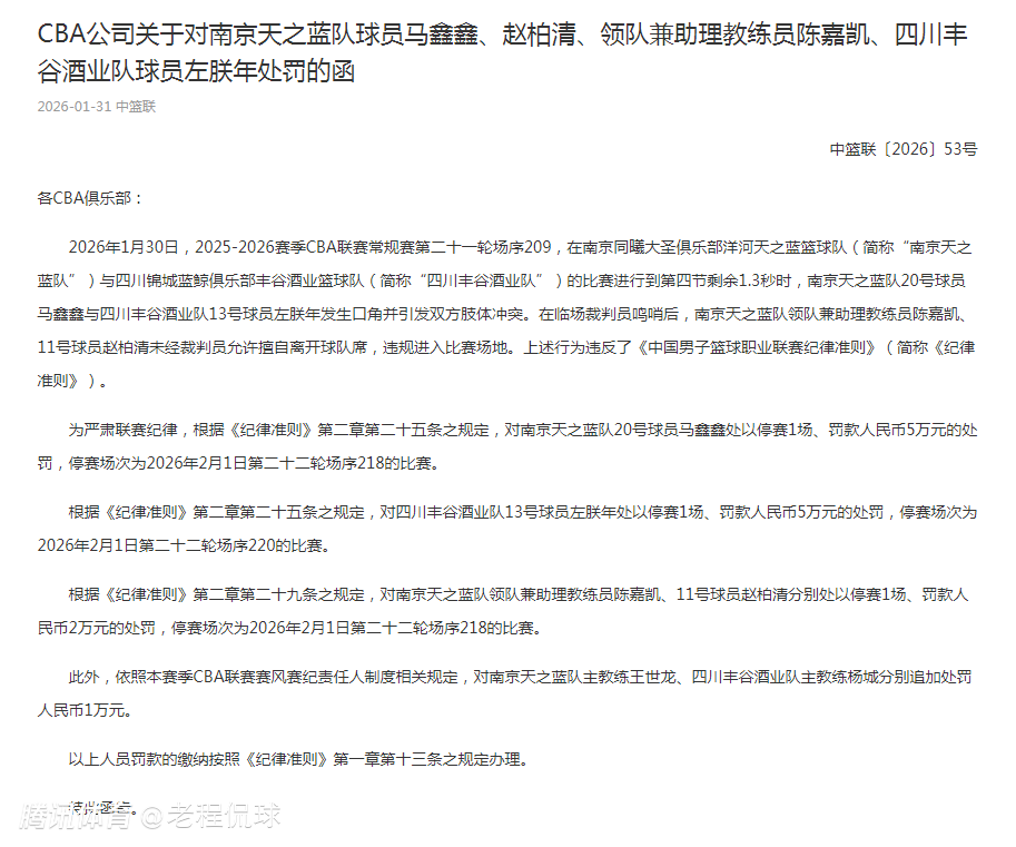 最终,CBA根据联赛规则对马鑫鑫和左朕年,均处以停赛1场、罚款5万元。陈嘉凯和赵柏清均被停赛1场、罚款2万元。
