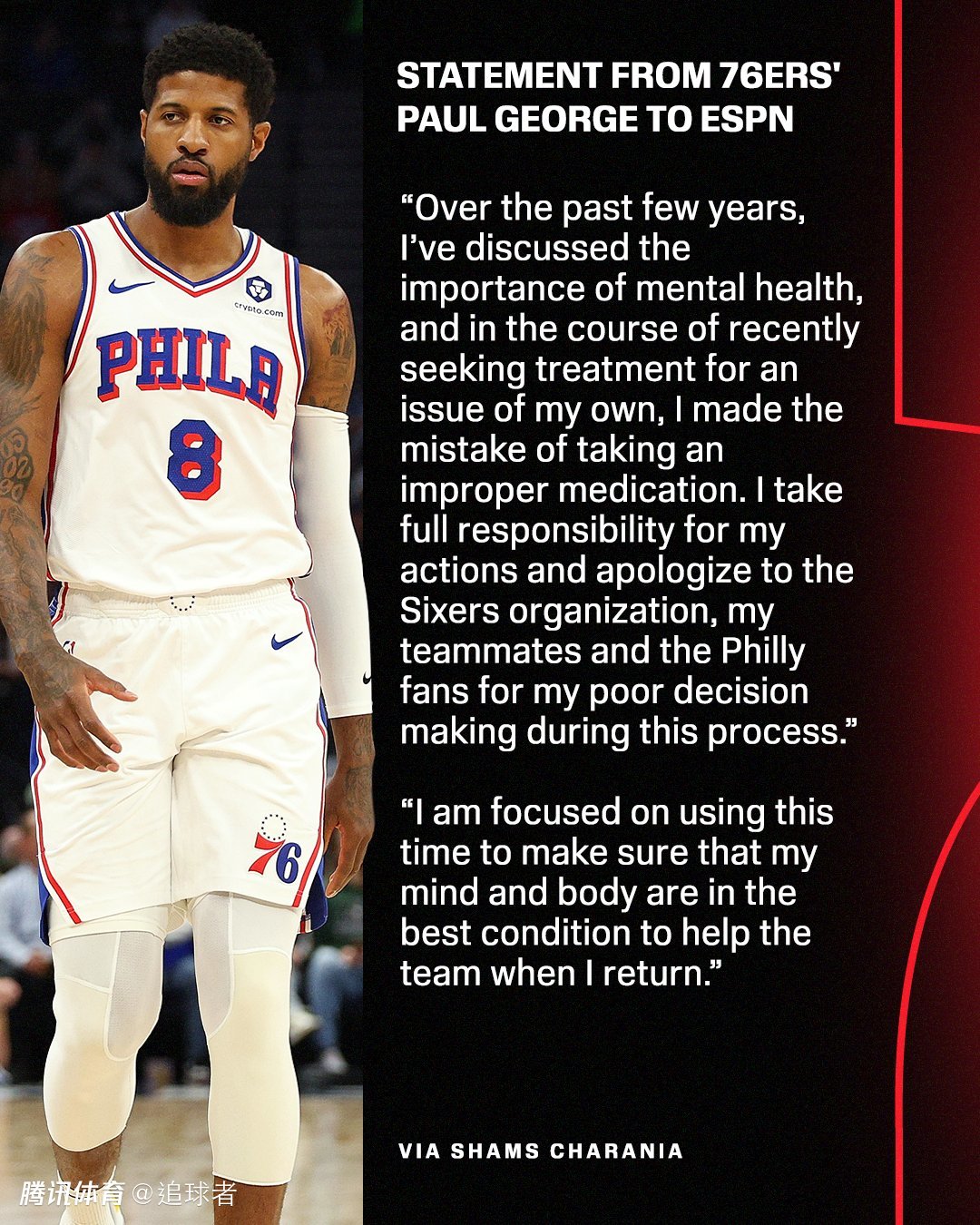 “过去几年,我一直在讨论心理健康的重要性。最近,我在治疗自身心理健康问题的过程中,错误地服用了不合适的药物。我愿为自己的行为承担全部责任,并就我在此过程中做出的错误决定向76人队、我的队友以及费城球迷道歉。我将专注于利用这段时间,确保我的身心都处于最佳状态,以便在回归后能够更好地帮助球队。”