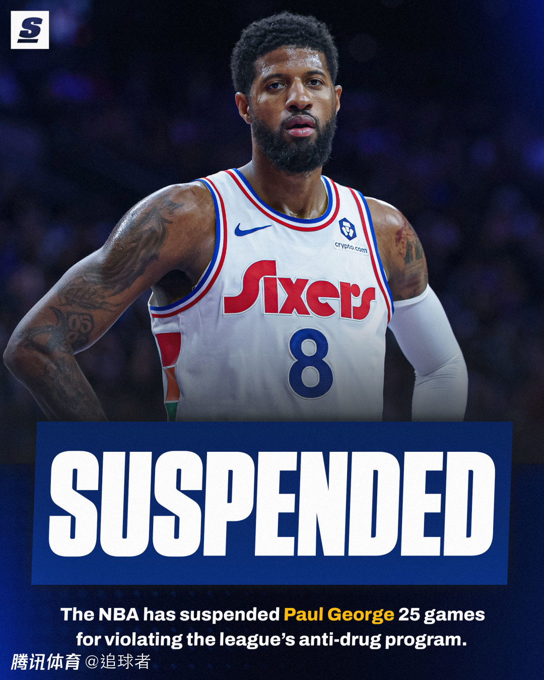 自从加盟76人以来,乔治已经多次遭遇伤病的困扰,而本赛季正处于激烈的排名争夺战阶段,35岁的乔治突然被联盟禁赛25场,NBA官方通报,乔治因违反联盟禁药政策,将被禁赛25场。