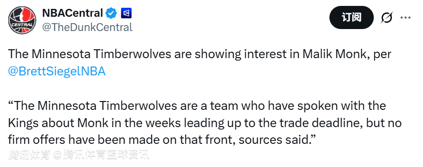 消息人士透露,森林狼在交易截止日前的数周里,已与国王队就蒙克的交易事宜进行沟通,但目前尚未提出正式报价。若能搭配选秀资产,篮网、奇才等队也可能会有意引进蒙克。