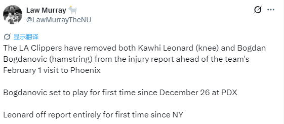 快船利好!莱昂纳德博格达诺维奇移出伤病报告 对阵太阳均可出战
