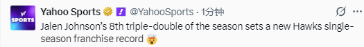 第8次三双!杰伦-约翰逊创队史新纪录 排名东部第一联盟第二