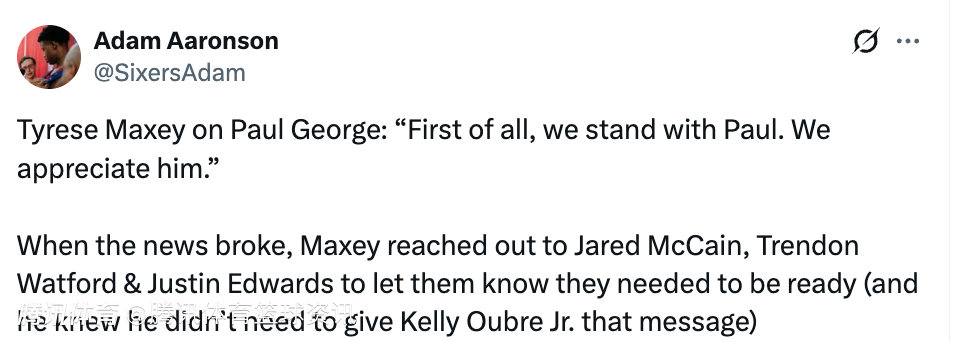 谈到因违反禁药条例被禁赛的乔治,马克西表示:“首先,我们和保罗站在一起,我们非常感谢他。作为一支球队,我们会团结在他身后,确保他一切都好,并为他提供任何所需的支持。”