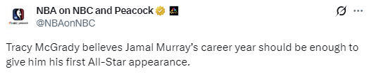 麦迪:贾马尔-穆雷该入选全明星 从未见过常规赛状态如此出色的他
