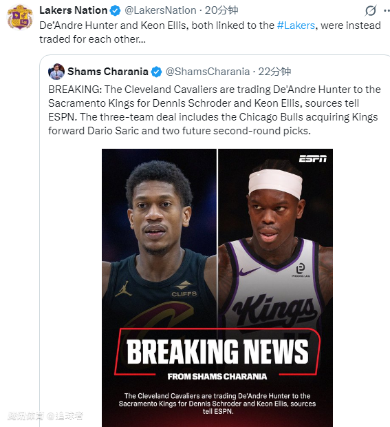 2026-02-01 12:40北京时间2月1日,NBA本赛季第二笔大交易来了,据ESPN名记Shams报道,骑士、公牛和国王达成三方交易,亨特被送到国王,施罗德则加盟骑士,萨里奇则是前往公牛。