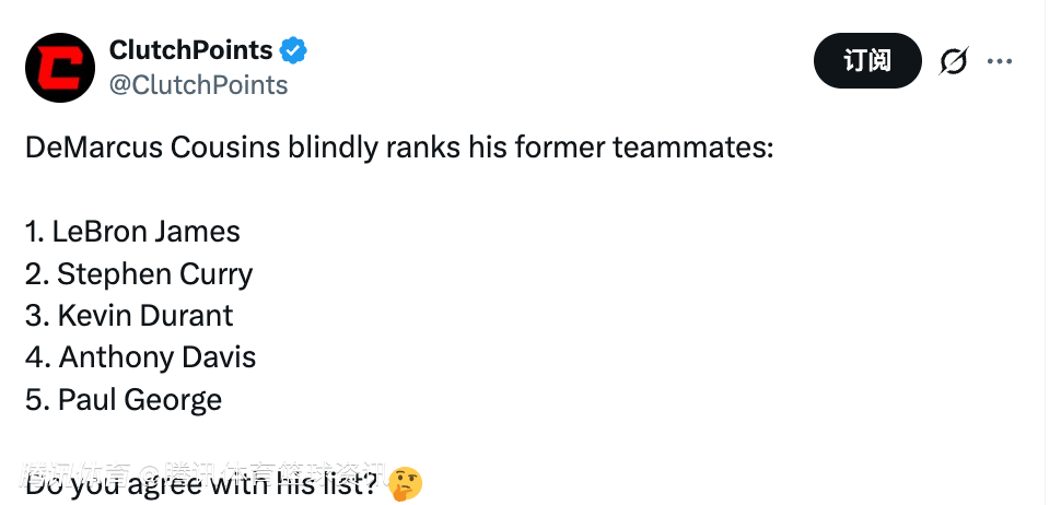 考辛斯盲排前队友:詹姆斯居首 库里杜兰特位列其次