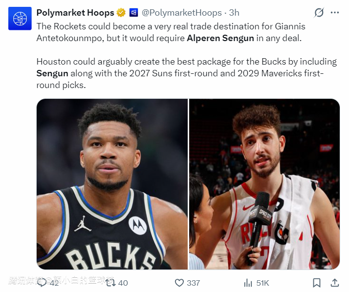 北京时间2月1日,美媒Polymarket Hoops报道:火箭可能会成为扬尼斯-阿德托昆博的潜在交易下家,但任何交易中都必须包含阿尔佩伦-申京才行,从某种角度来看,火箭纳入申京、2027年太阳首轮、2029年独行侠首轮签,这样足以满足雄鹿队的需求。