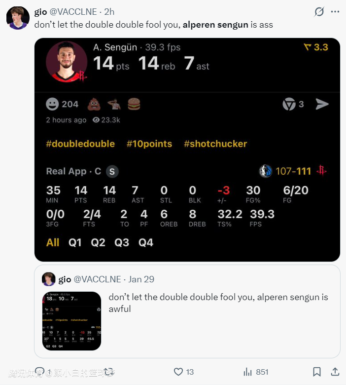 但更多的美媒还是觉得申京过于拉胯,申京35分钟,20中6,命中率只有30%,拿到14分14篮板7助攻2失误,不要被他的两双欺骗了,他还是一个混蛋。