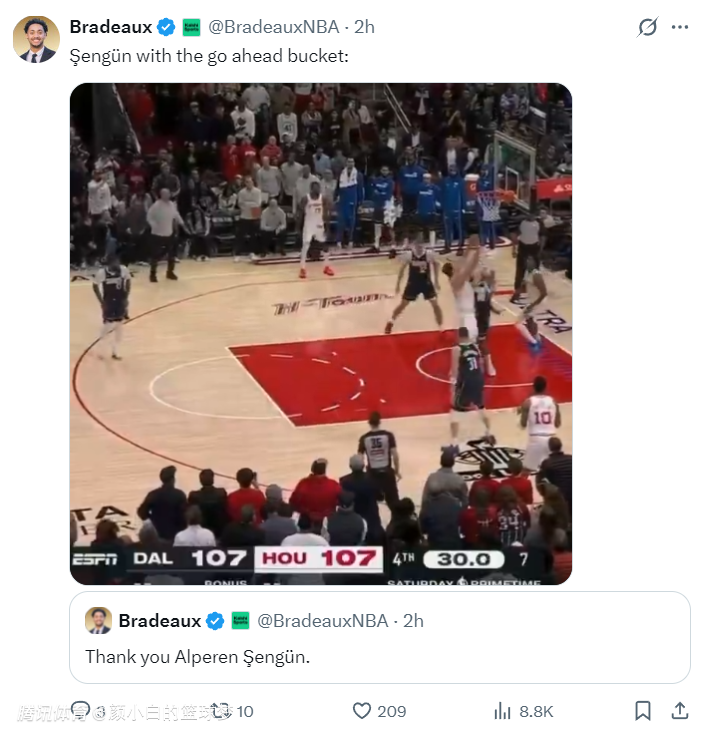 赛后火箭记者Bradeaux也为申京、杜兰特辩护,这两人本场比赛37中12手感不佳,但火箭还是赢球了,因为这两人合力送出15次助攻,全队33次助攻只有6次失误。
